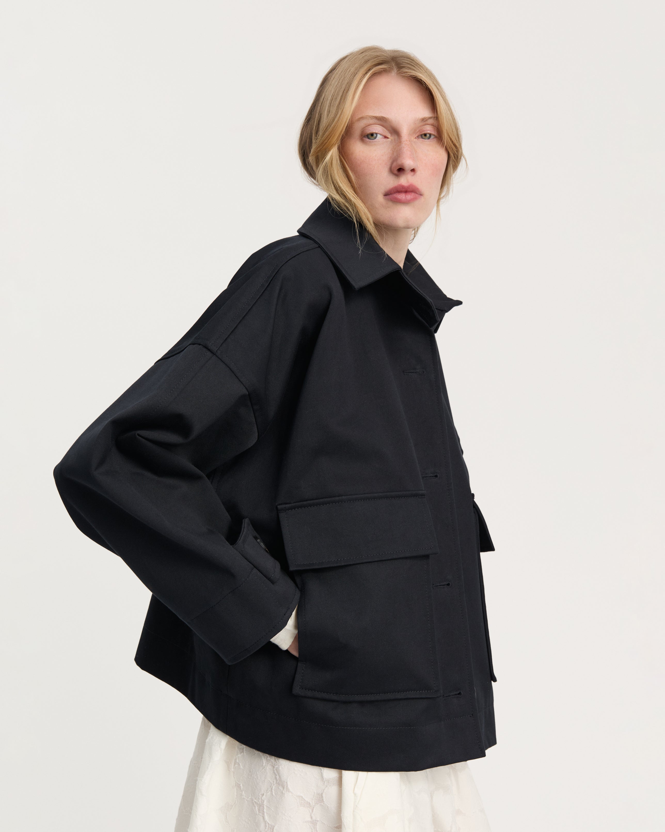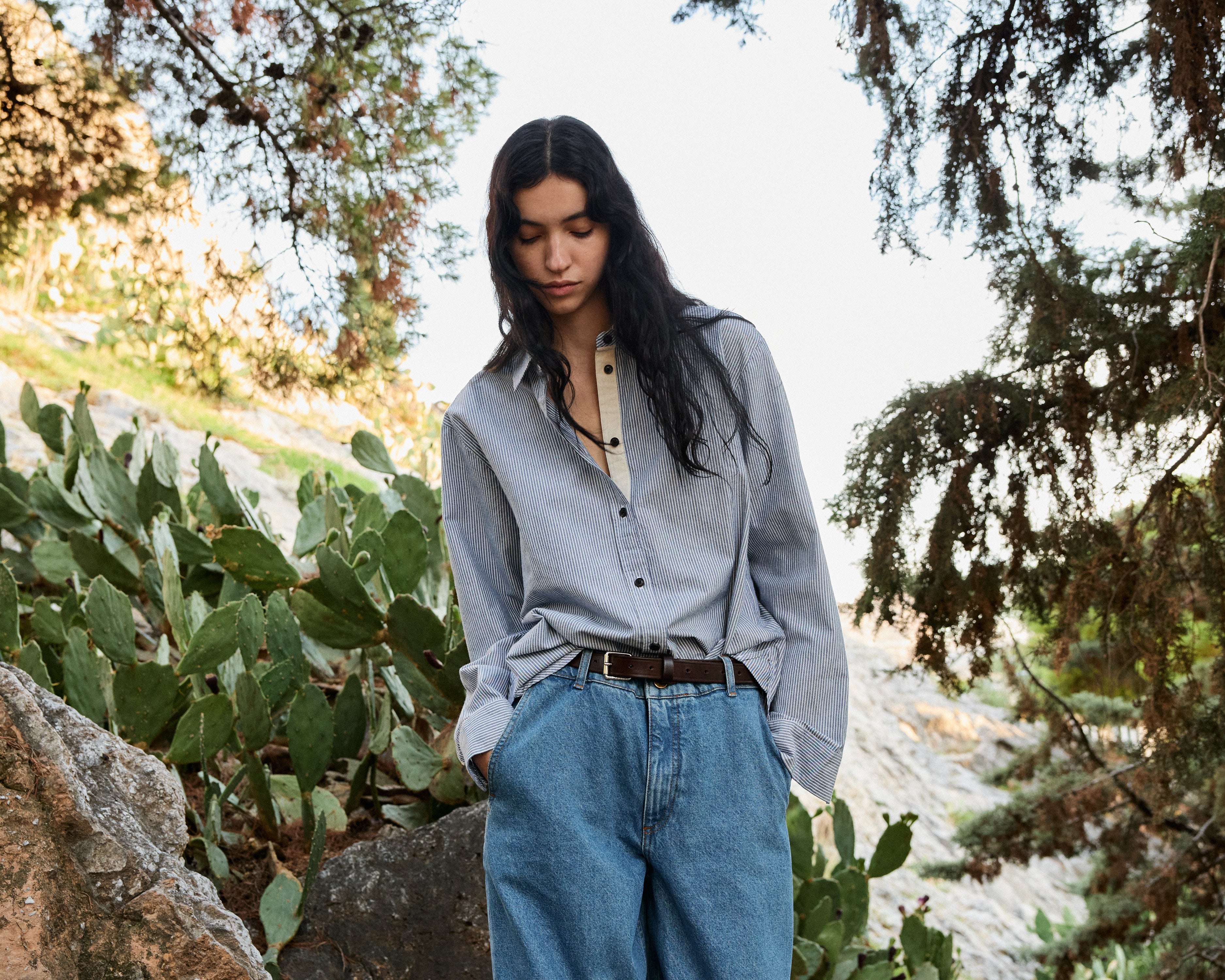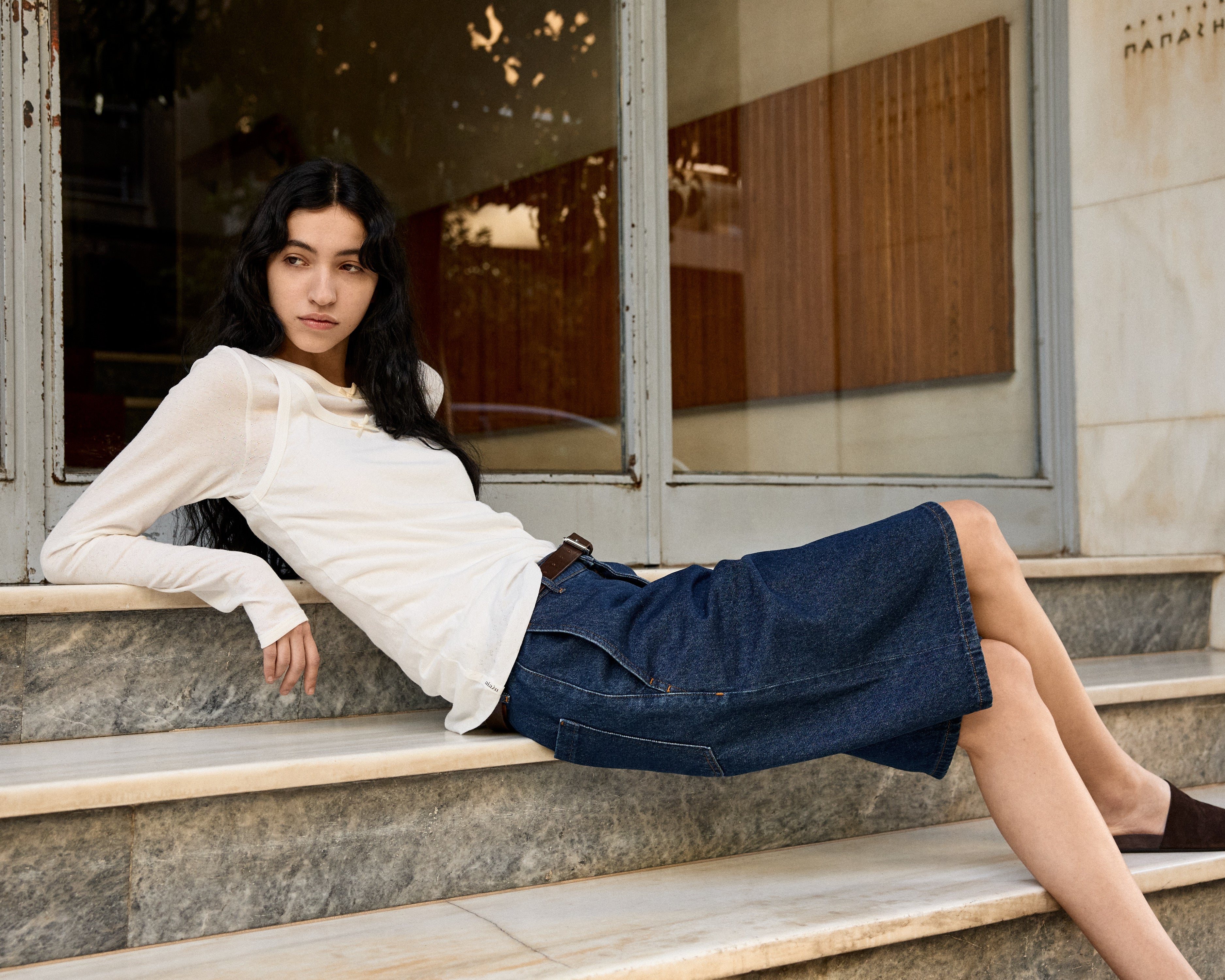 Feminine silhuetter udfolder sig i enkelhed og fine workwear-detaljer, i varme lag-på-lag og en farvepalette af jordnære grønne nuancer og nuanceret beige.