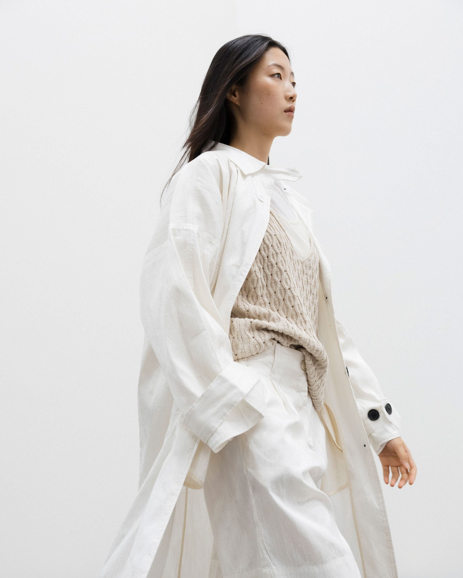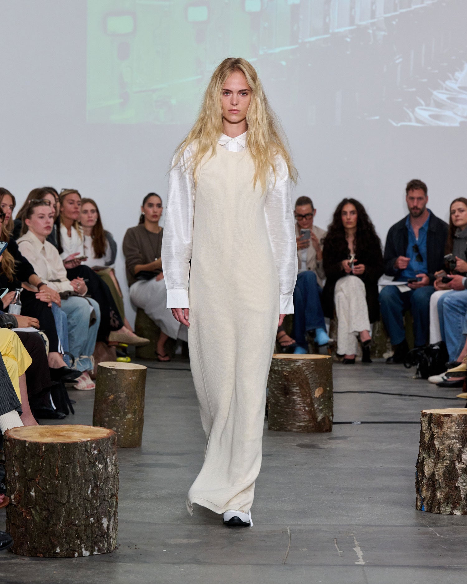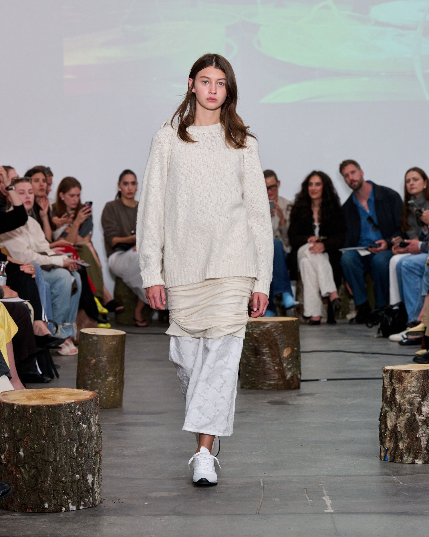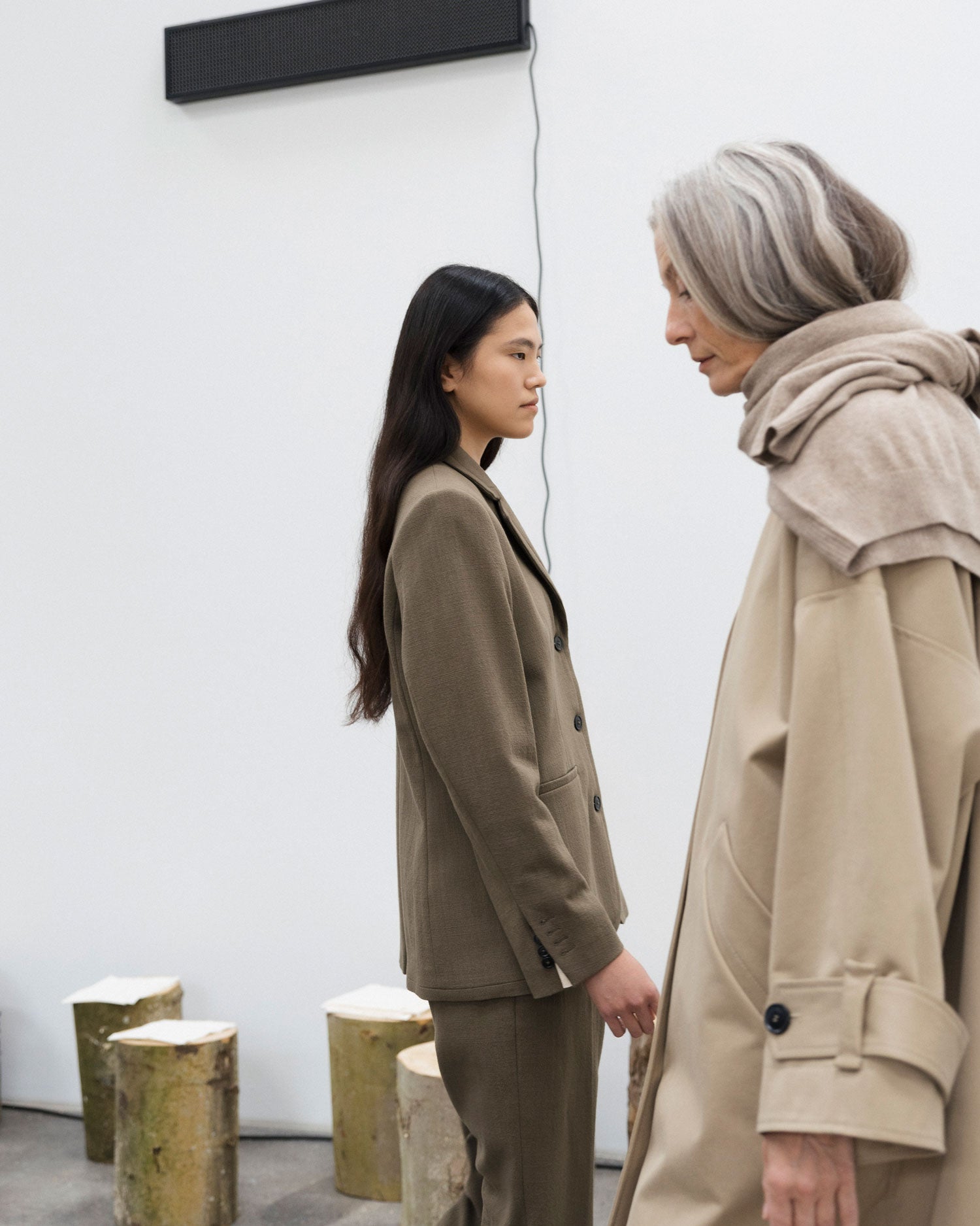 Tro mod vores bankende hjerte for håndværkere og kunstnere afholdt vi vores show i galleriet Nils Stærk i København. Showet var en hybrid mellem installation og runway, der fejrede vores to årtier, hvor naturlige materialer og teknologi mødtes og skabte et delt rum. Kernen af aiayu blev fortalt i galleriets rene, hvide lokaler, hvor videoprojektioner fra vores arkiver og rejser viste vores fibres oprindelse og produktion i Bolivia, Indien og Portugal.
